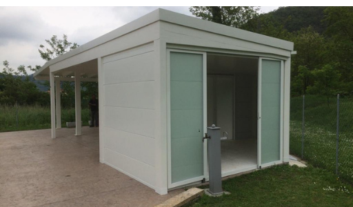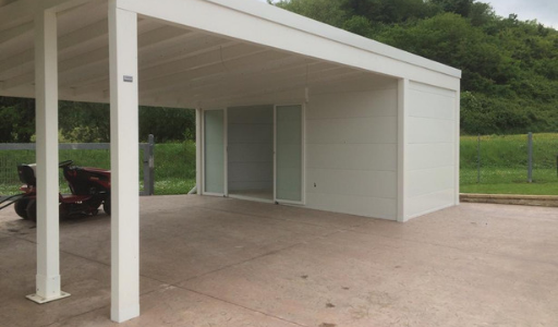 Ampliamento struttura in legno esistente con un’altra struttura sempre in legno con annesso ricovero attrezzi in pannelli sandwich e porte scorrevoli in alluminio vetro.