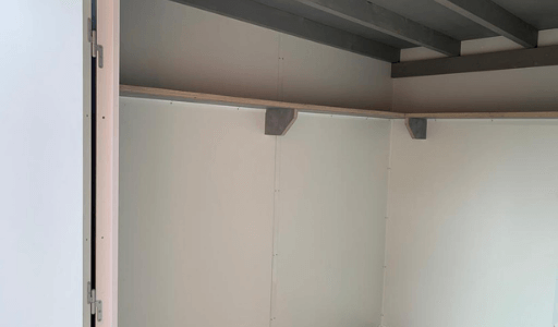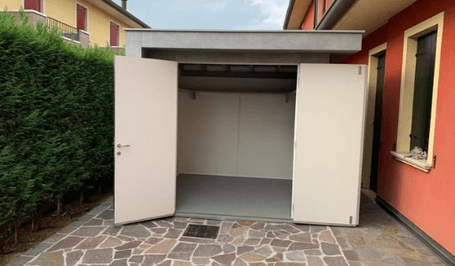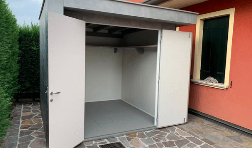 Casetta in HPL laminato con pareti isolate, pavimento, porta doppia e ripiani interni