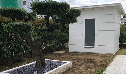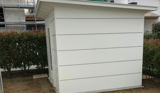 Casetta in Okumé multistrato marino di misura cm 250×250, una porta con vetro, pavimento interno e lattoneria su tetto in alluminio.