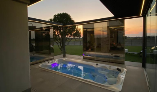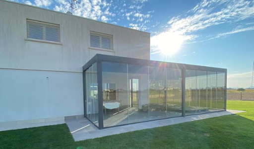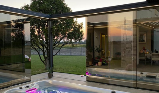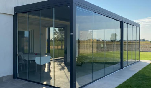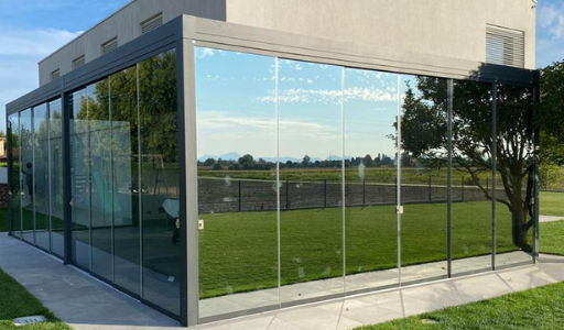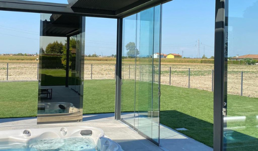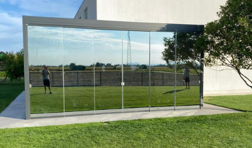 Doppia pergola Bioclimatica, una a tetto orientabile e una impacchettatile completa di vetri scorrevoli specchiati.