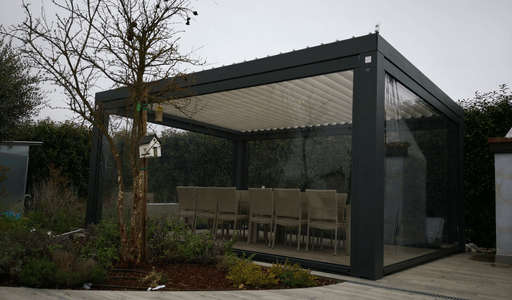 Pergola Bioclimatica R600 Pergoklima autoportante bi-colore, con luci a led e tende ermetiche con Cristal perimetrali.