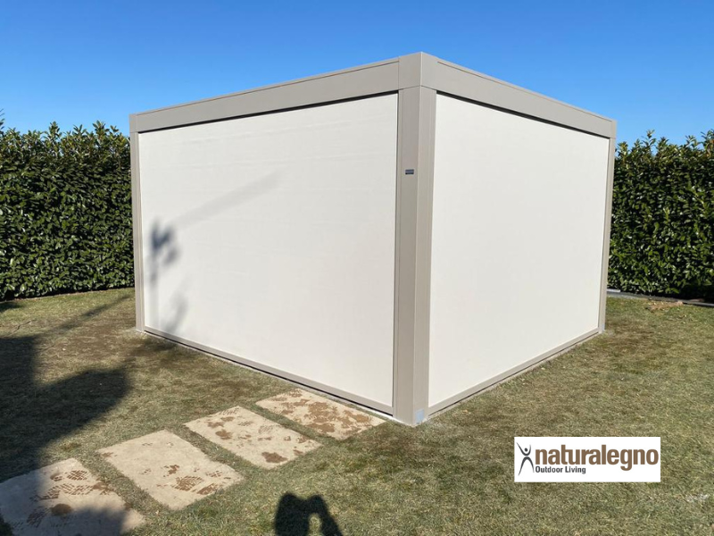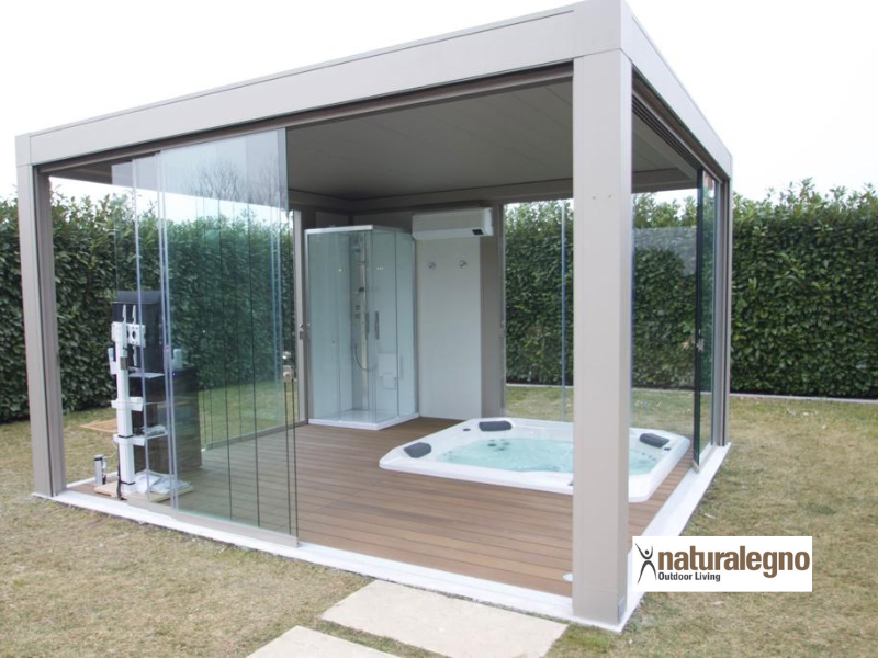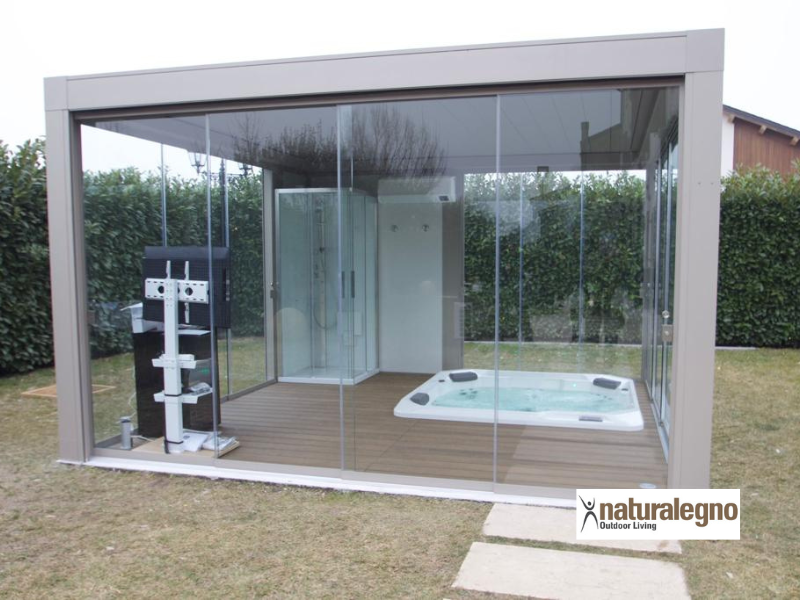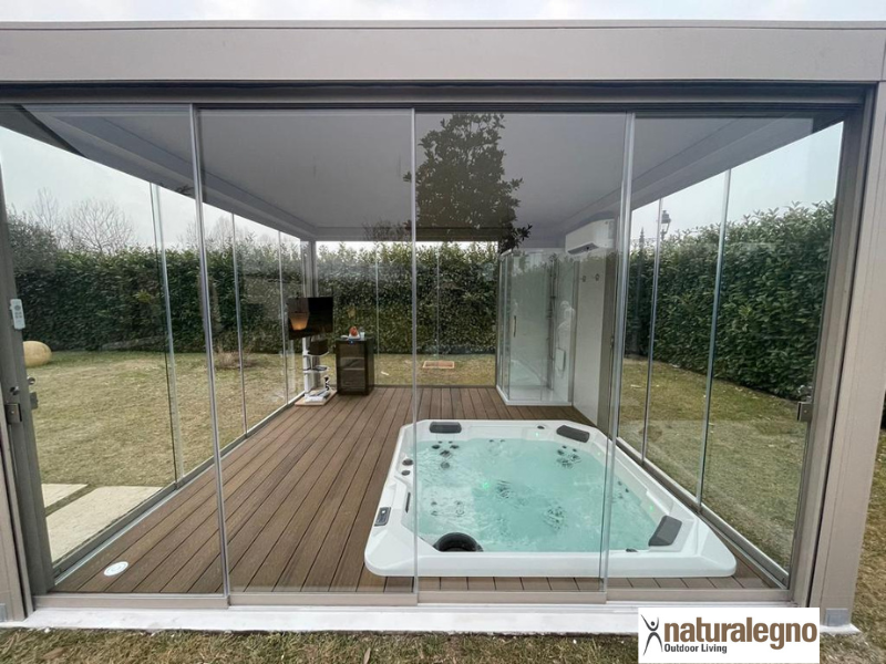 Lavori eseguiti: pergola Brera P autoportante con vetro Slide Glass, tende Raso con tessuto Screen e vasca indromassaggio incassata Relay.