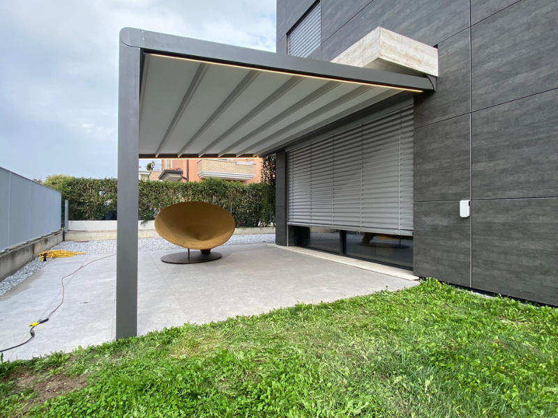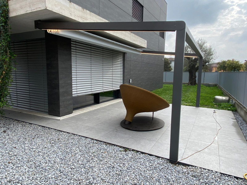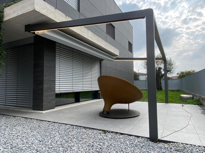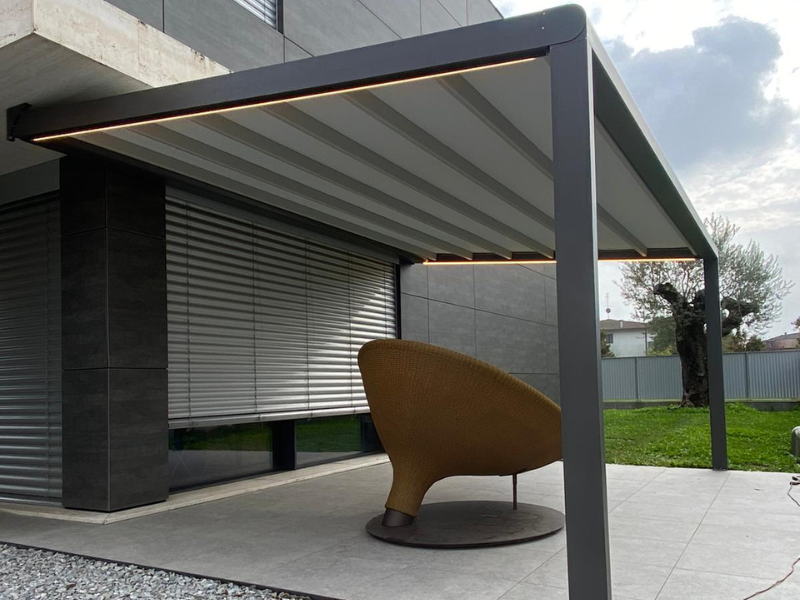 Pergola Icover in alluminio con copertura in telo PVC e luci.