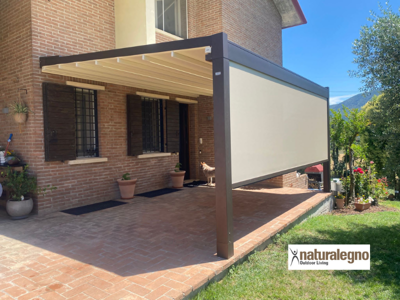Lavori eseguiti: pergotenda modello Fusion con tenda Raso frontale in tessuto Screen.