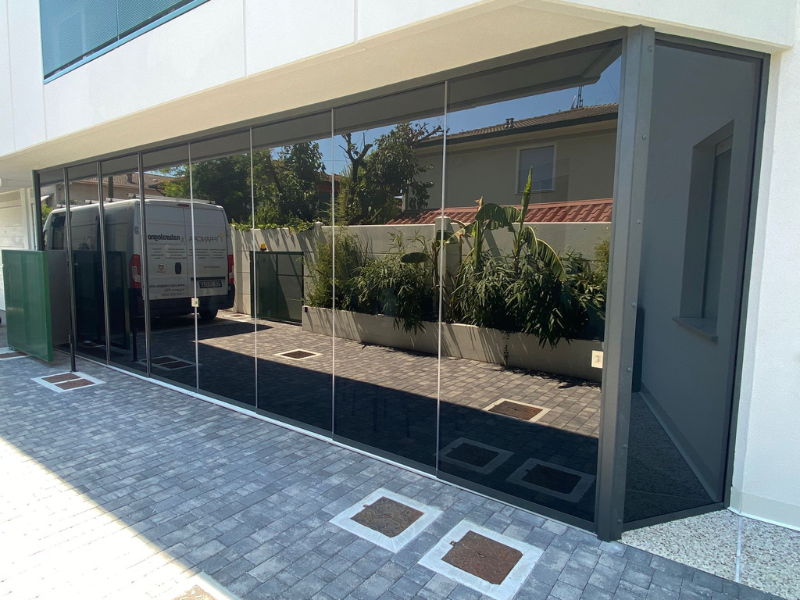 Chiusura sotto poggiolo con vetrate panoramiche Slide Glass effetto Fumè