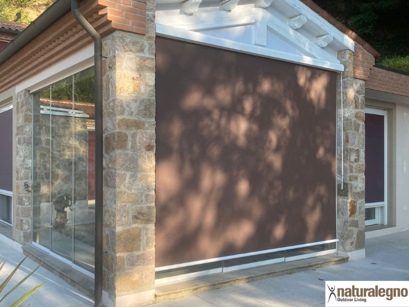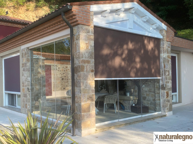 Lavori eseguiti: Chiusura portico con vetrata Slide Glass scorrevole e applicazione tenda a rullo con cavetti per il sole con tessuto Veozip.