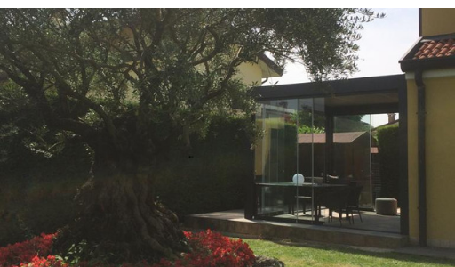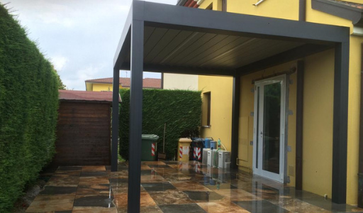 Struttura Bio-climatica Camargue, copertura a lamelle orientabili, luci a led su lame, vetri scorrevoli Tuttovetro, pavimentazione in gres su piedini regolabili.