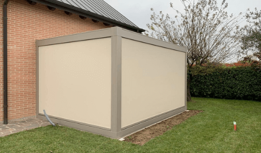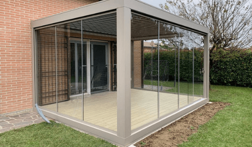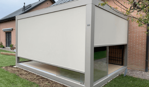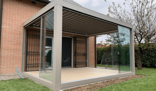 Struttura Bioclimatica Opera con tende Raso integrate, vetri SlideGlass, luci integrate e pedana set con pavimentazione in WPC.