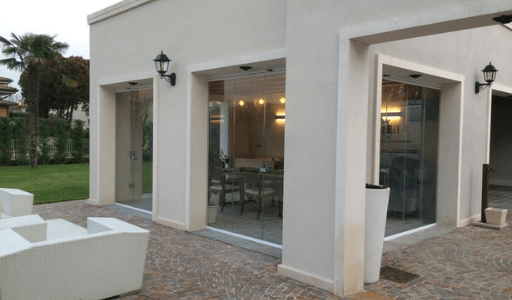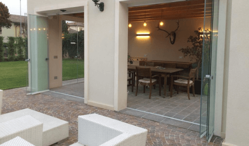 Applicazione vetrate panoramiche G80 pieghevoli, vetro temperato da 10 mm senza telaio.