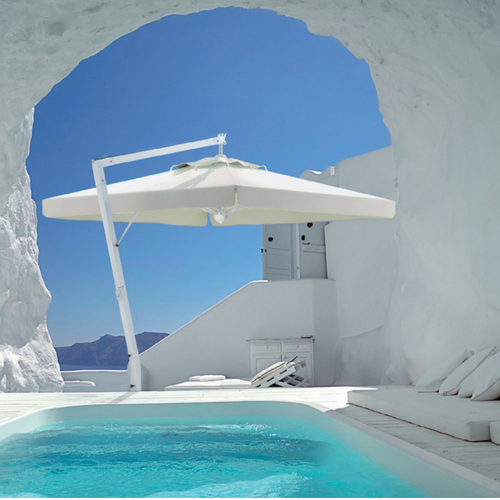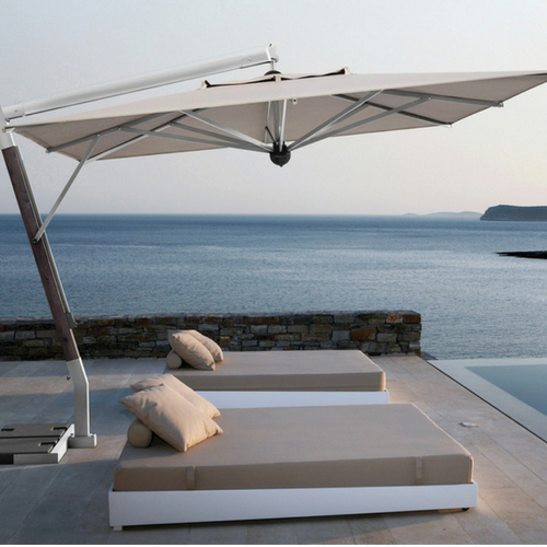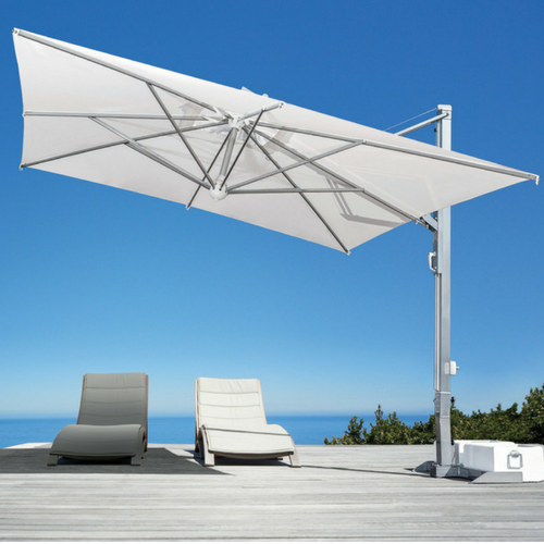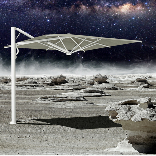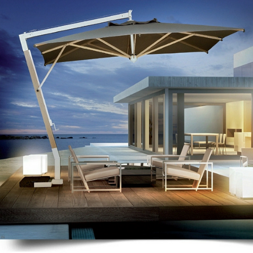 Questo modello unisce i vantaggi degli ombrelloni a palo centrale con quelli degli ombrelloni a palo laterale, poiché si regge su di un braccio laterale regolabile che non intralcia e che permette di ottenere sempre l’ombra desiderata.